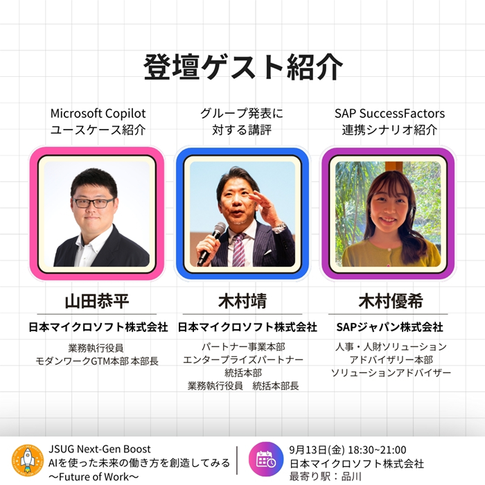 ÆâÍÆ | 1¡§¥¤¥Ù¥ó¥ÈÌÜŪ¡¦NGB¾Ò²ð¡Ê18:30¡Á18:40¡Ë 2¡§Microsoft 365 Copilot ¥æ¡¼¥¹¥±¡¼¥¹¾Ò²ð¡Ê18:40¡Á19:00¡Ë 3¡§SAP Success Factor ¡ßM365 CopilotÏ¢·È¥·¥Ê¥ê¥ª¡Ü¤½¤Î¾¥·¥Ê¥ê¥ª¾Ò²ð¡Ê19:00¡Á19:10¡Ë 4¡§Copilot for Microsoft 365³èÍÑ¥±¡¼¥¹¤Î¥°¥ë¡¼¥×¥ï¡¼¥¯¡Ê19:10¡Á20:10¡Ë 5¡§¥°¥ë¡¼¥×¥¢¥¤¥Ç¥£¥¢¤ËÂФ¹¤ë¹Öɾ¥¿¥¤¥à¡Ê20:10¡Á20:20¡Ë 6¡§JSUG NGB¤è¤êÄù¤á¡Ê20:20¡Á20:25¡Ë 7¡§º©¿Æ²ñ¡Ê20:25¡Á21:00¡Ë ¢¢ ¹Ö±é¼Ô¾ðÊó ¡ÆüËÜ¥Þ¥¤¥¯¥í¥½¥Õ¥È³ô¼°²ñ¼Ò ¶È̳¼¹¹ÔÌò°÷ ¥â¥À¥ó¥ï¡¼¥¯GTMËÜÉô ËÜÉôĹ »³ÅĶ³Ê¿»á ¢ÆüËÜ¥Þ¥¤¥¯¥í¥½¥Õ¥È³ô¼°²ñ¼Ò ¥Ñ¡¼¥È¥Ê¡¼»ö¶ÈËÜÉô ¥¨¥ó¥¿¡¼¥×¥é¥¤¥º¥Ñ¡¼¥È¥Ê¡¼Åý³çËÜÉô ¶È̳¼¹¹ÔÌò°÷ Åý³çËÜÉôĹ ÌÚ¼Ì÷»á £SAP¥¸¥ã¥Ñ¥ó³ô¼°²ñ¼Ò¡¡¿Í»ö¡¦¿Íºâ¥½¥ê¥å¡¼¥·¥ç¥ó¥¢¥É¥Ð¥¤¥¶¡¼¡¡ÌÚ¼ͥ´õ |